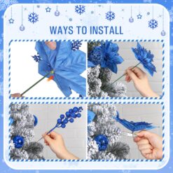 24 Pcs Blue Boxed 12Pcs Poinsettias Artificial Christmas Flowers+12Pcs Holly Berry Stems for Christmas Tree Decor
