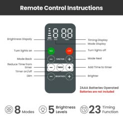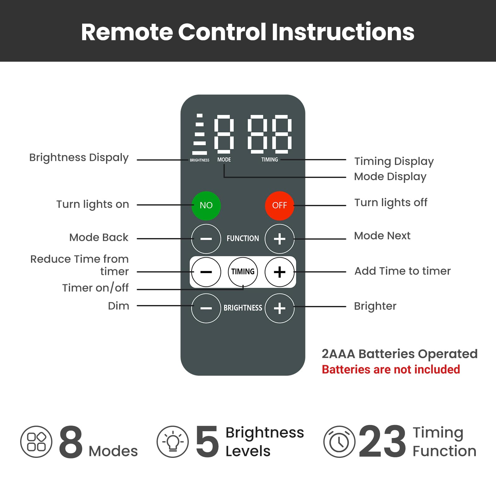 - 🎄【Remote Control】23 kind of timer choices + 5 levels of brightness +8 different lighting modes(4 Warm White & 4 Colored)for you to choose. It operated by 2AAA battery. (Note: batteries are not included.)